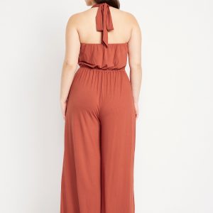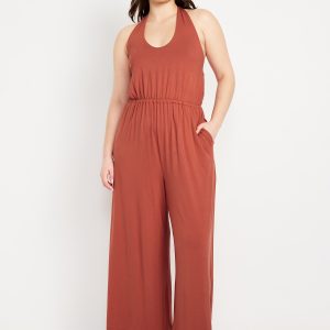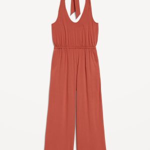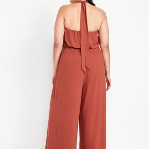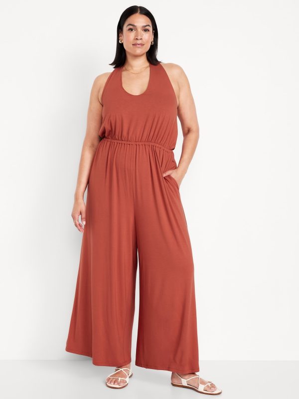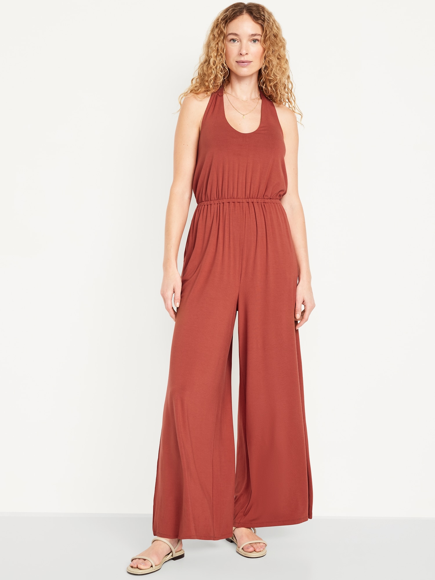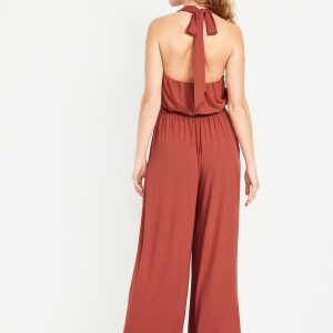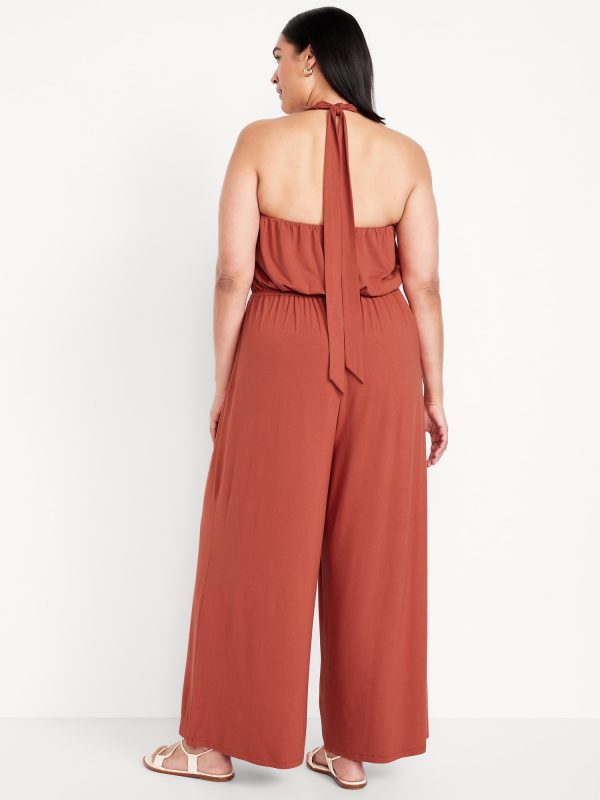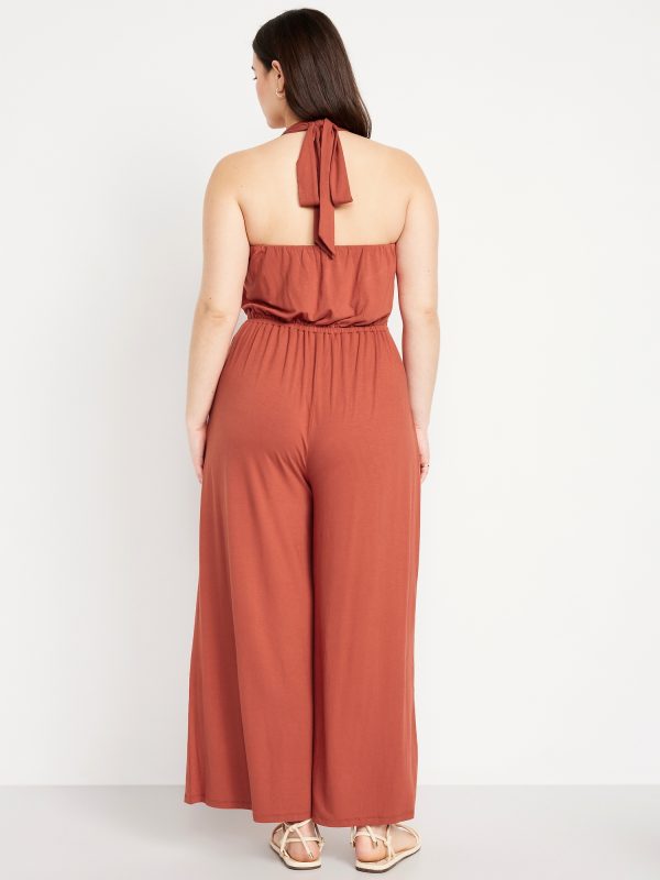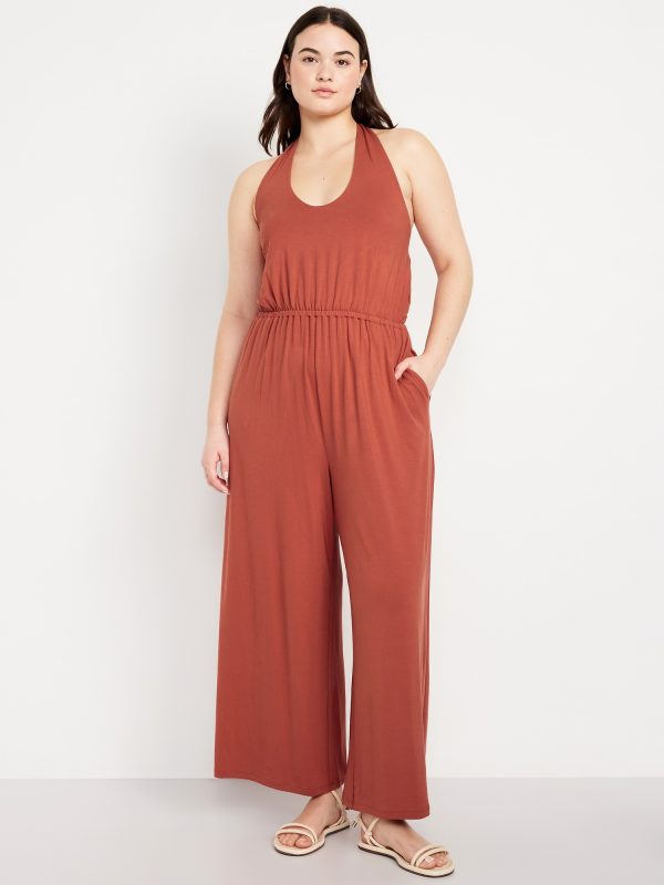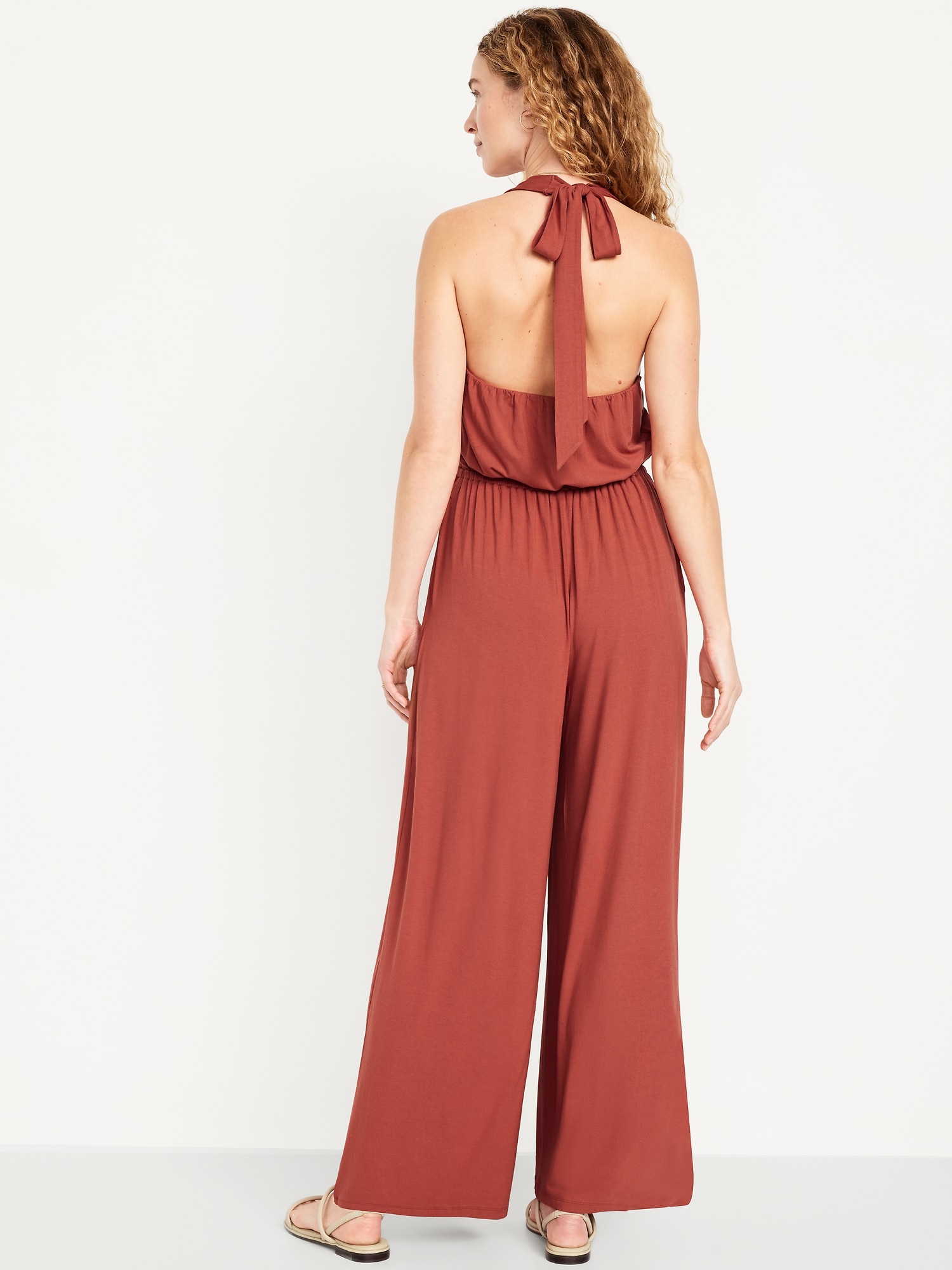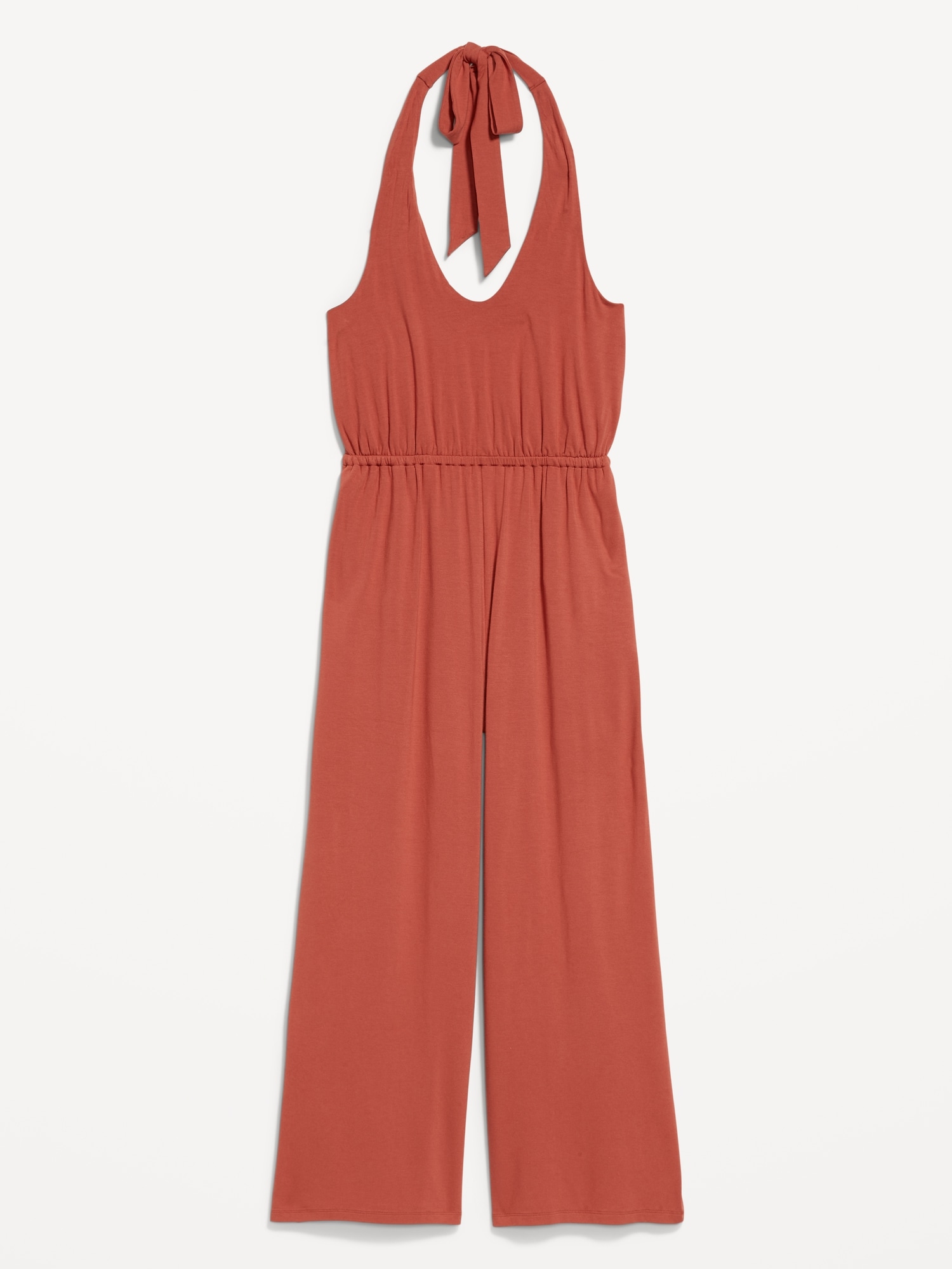 Waist-Defined Halter Jumpsuit: scoop neck, tie-back halter straps, shirred elastic waist, wide leg, #705487