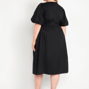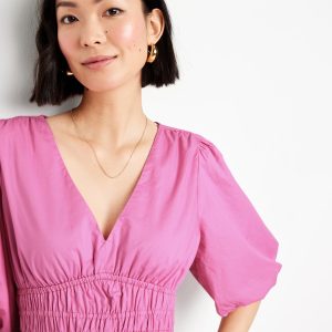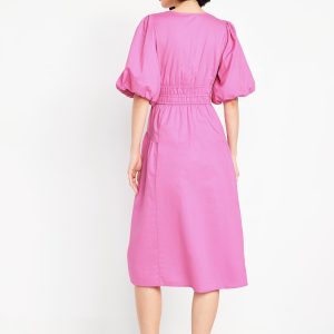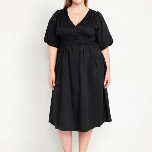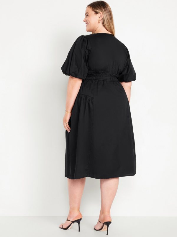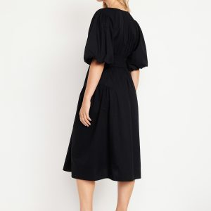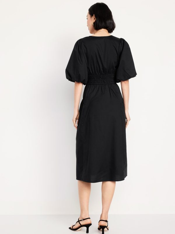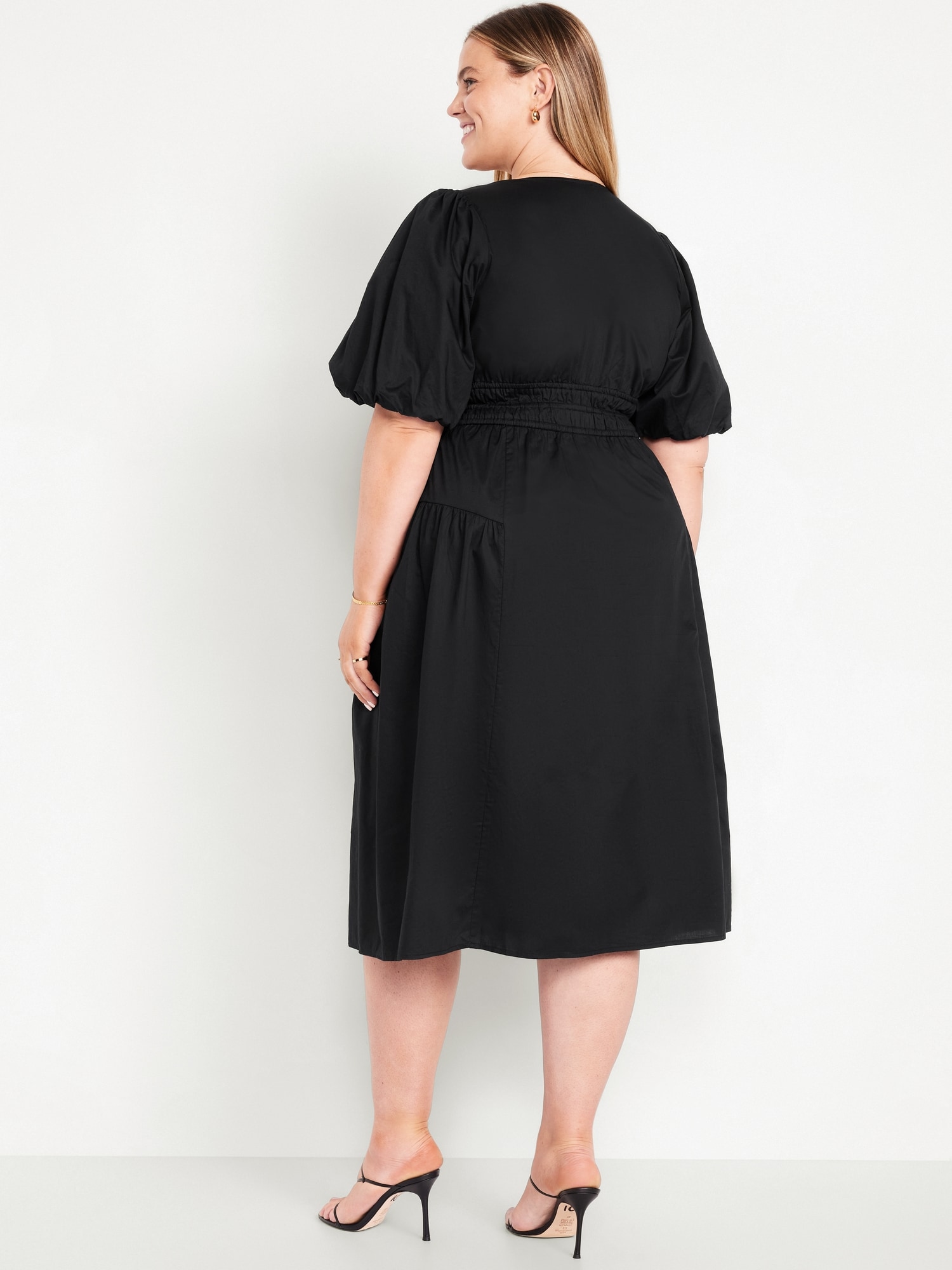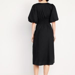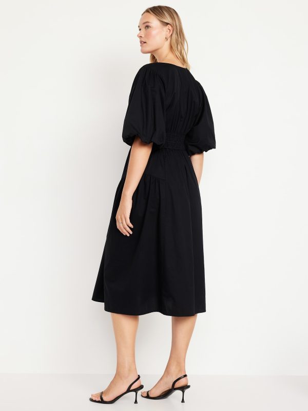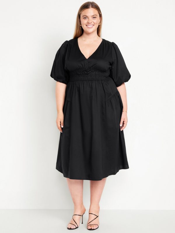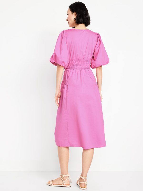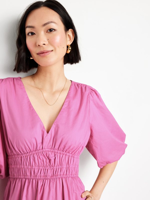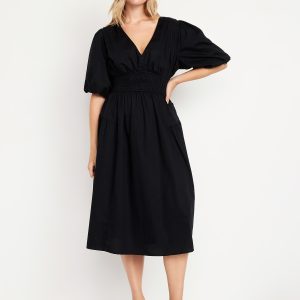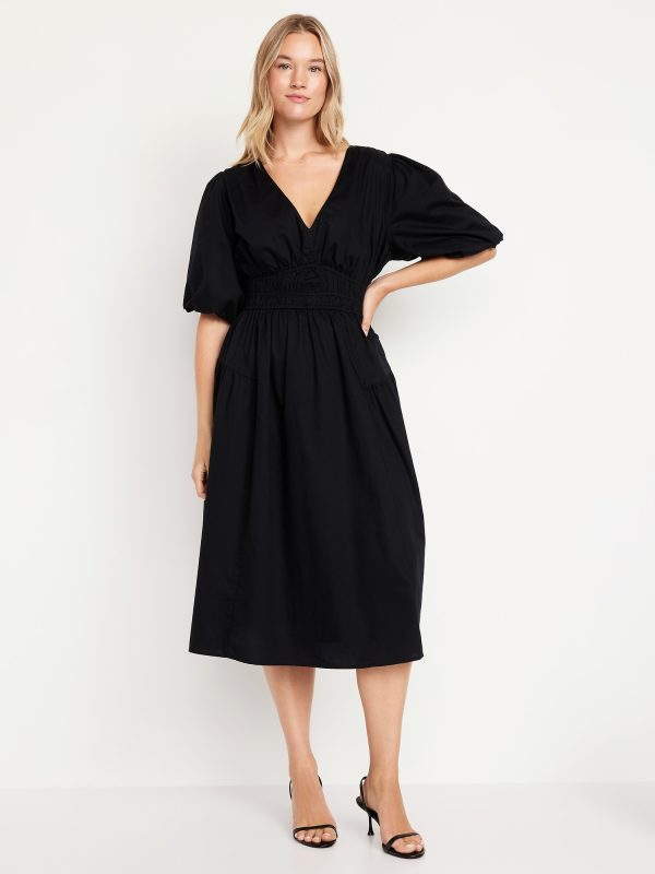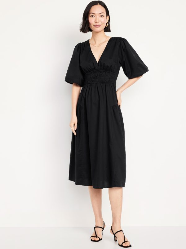Waist-Defined Puff-Sleeve Midi Dress: v-neck, elbow-length puff sleeves, elastic cuffs, smocked waist, vertical striped print, #750072
