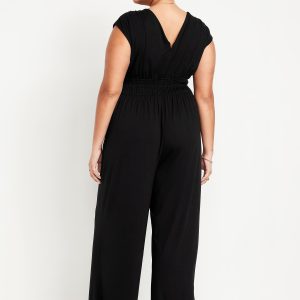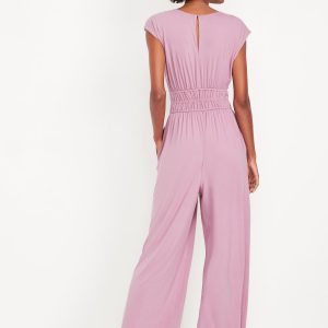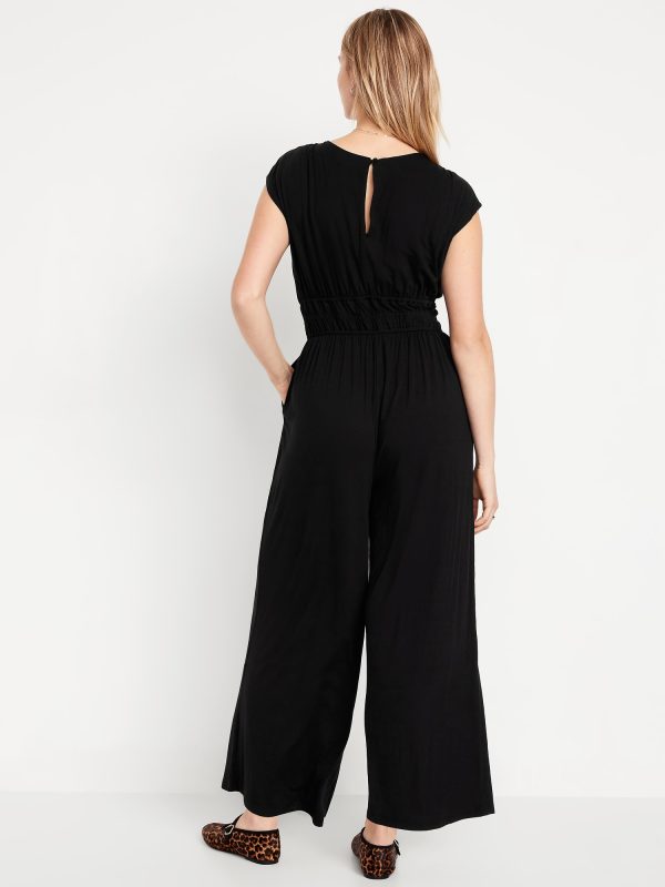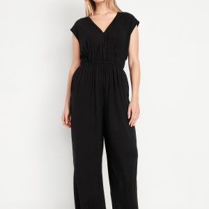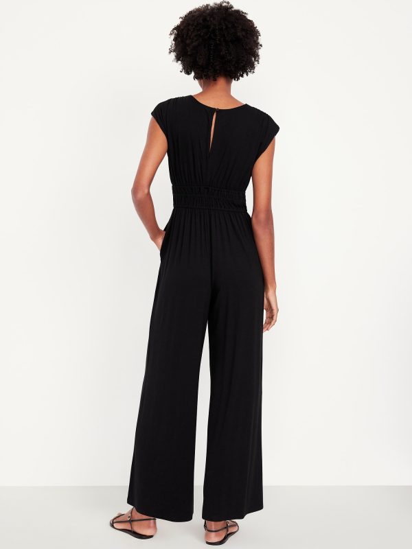 Waist-Defined Wide-Leg Jumpsuit: deep v-neck, sleeveless, elastic waist, on-seam hip pockets, wide leg, #705285