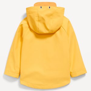 Water-Resistant Unisex Critter Hooded Jacket for Toddler: built-in hood, duck “eyes” and “bill” at crown, long sleeves, decorative flap pockets at hem, full length snap-button and zipper, online exclusive, #801413