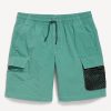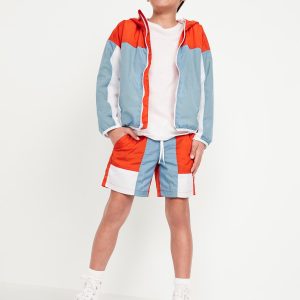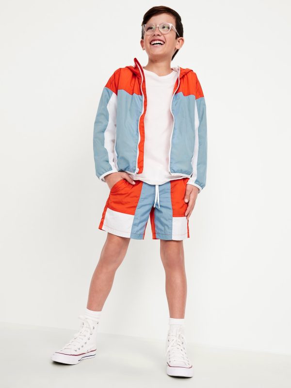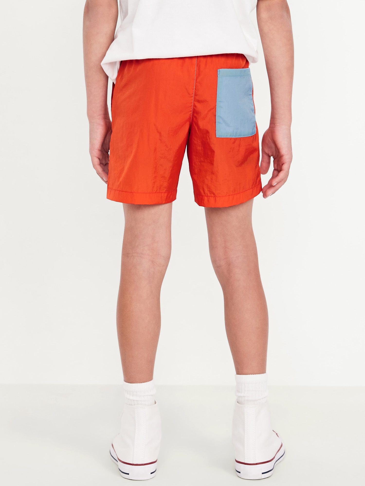 Water-Resistant Windbreaker Shorts for Boys: elastic-drawstring waist, diagonal front pockets, back right patch pocket, color-blocked panels, #766368