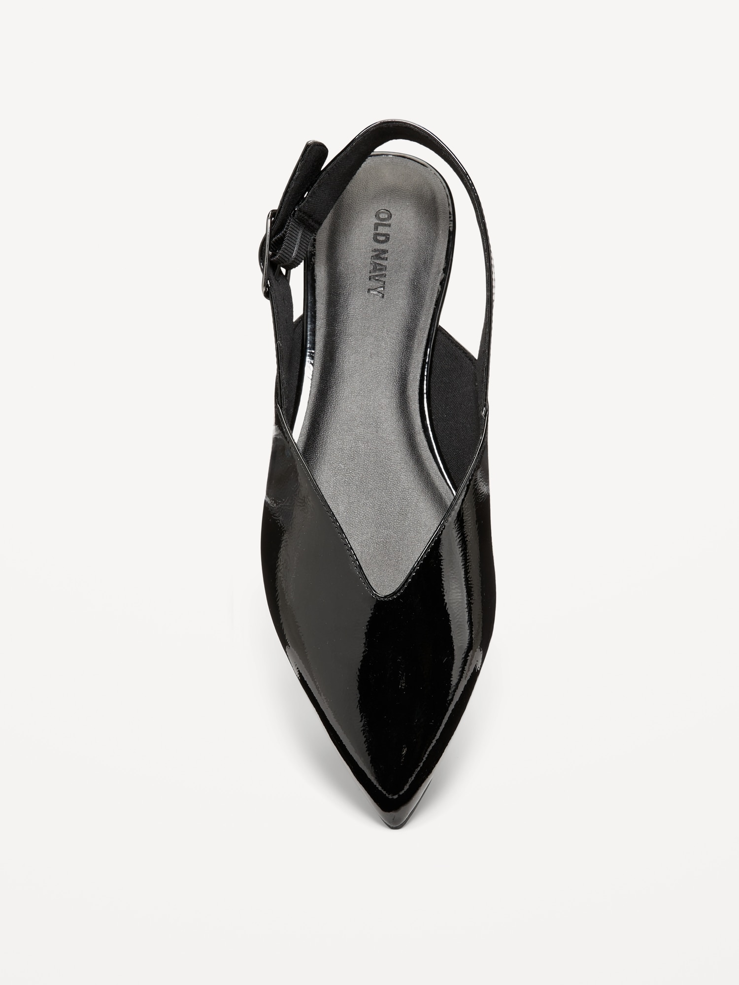 Wide Strap Slingback Flats: pointed toe, V-cut, buckle fastening at ankle, open heel, firm foot bed, textured outsole, #750760