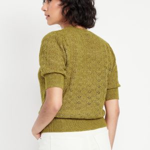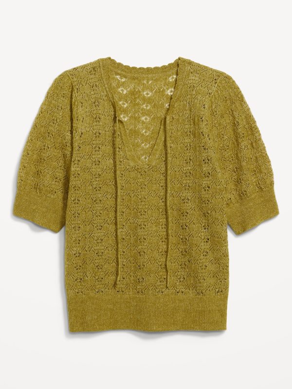Wool-Blend Puff-Sleeve Tie-Neck Sweater: tie-front neck with keyhole cutout, elbow-length puff sleeves, pullover style, #785108